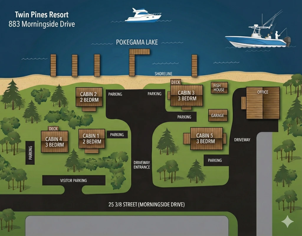 5 Cabins • 1–3 Bedrooms • Sandy Swim Area • Fishing Dock • Campfire Rings • Wi‑Fi